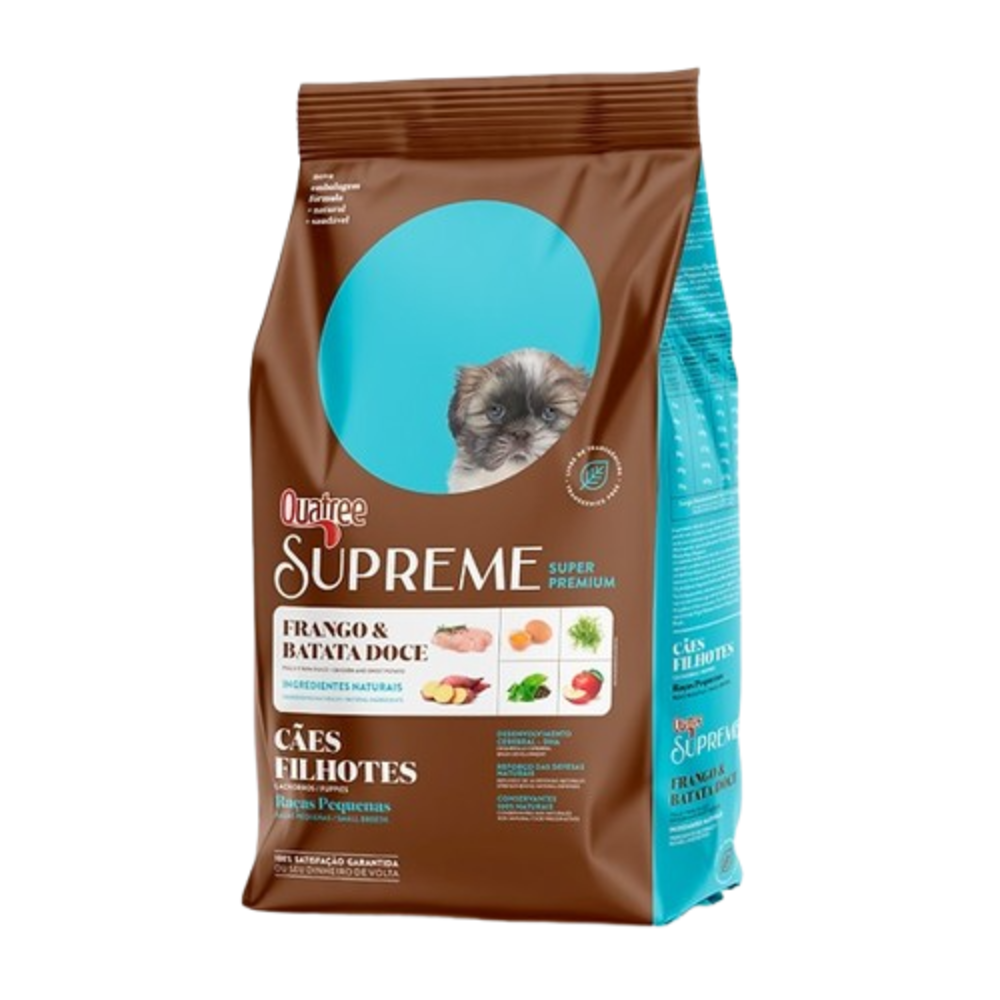 Quatree Supreme Filhotes Raças Pequenas é um alimento Super Premium formulado com conservantes 100% naturais e livre de transgênicos, garantindo fácil digestão e absorção dos nutrientes. A combinação de proteínas selecionadas e ingredientes naturais e funcionais garante mais saúde e vitalidade para o seu cão.